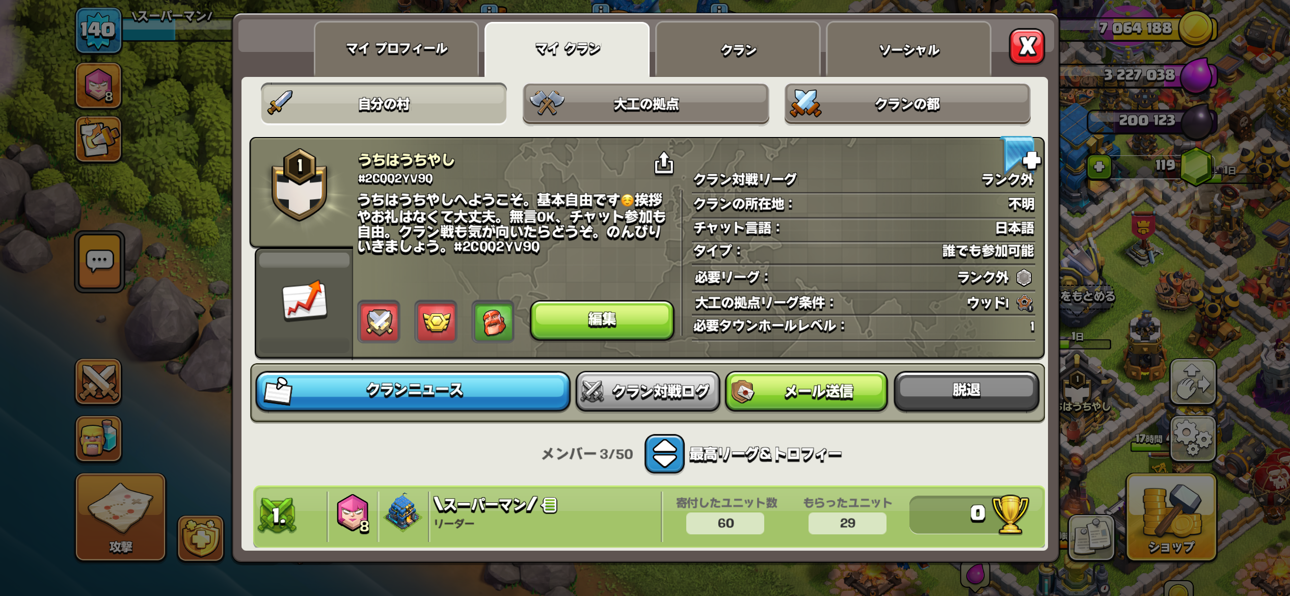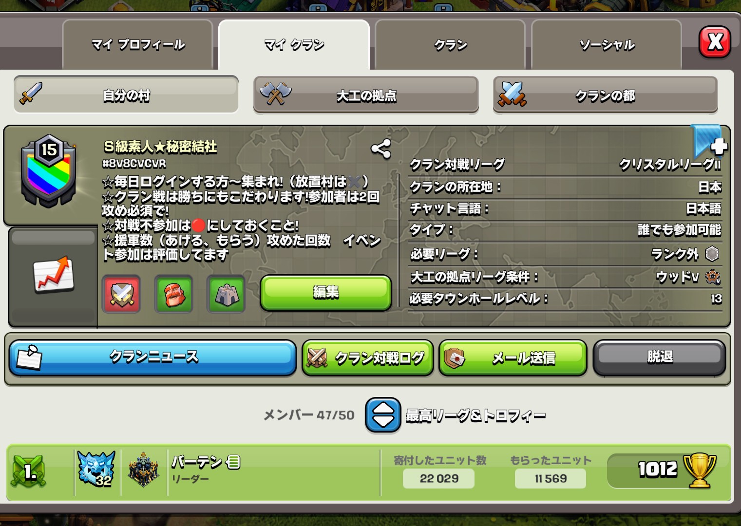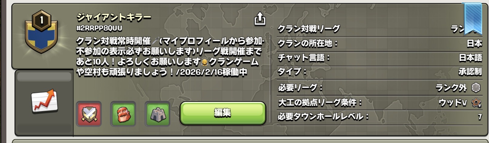 一旦の目標はクランレベル5と空村をディガーまで解放すること、リーグ戦やクランゲームができる人数を集めています!