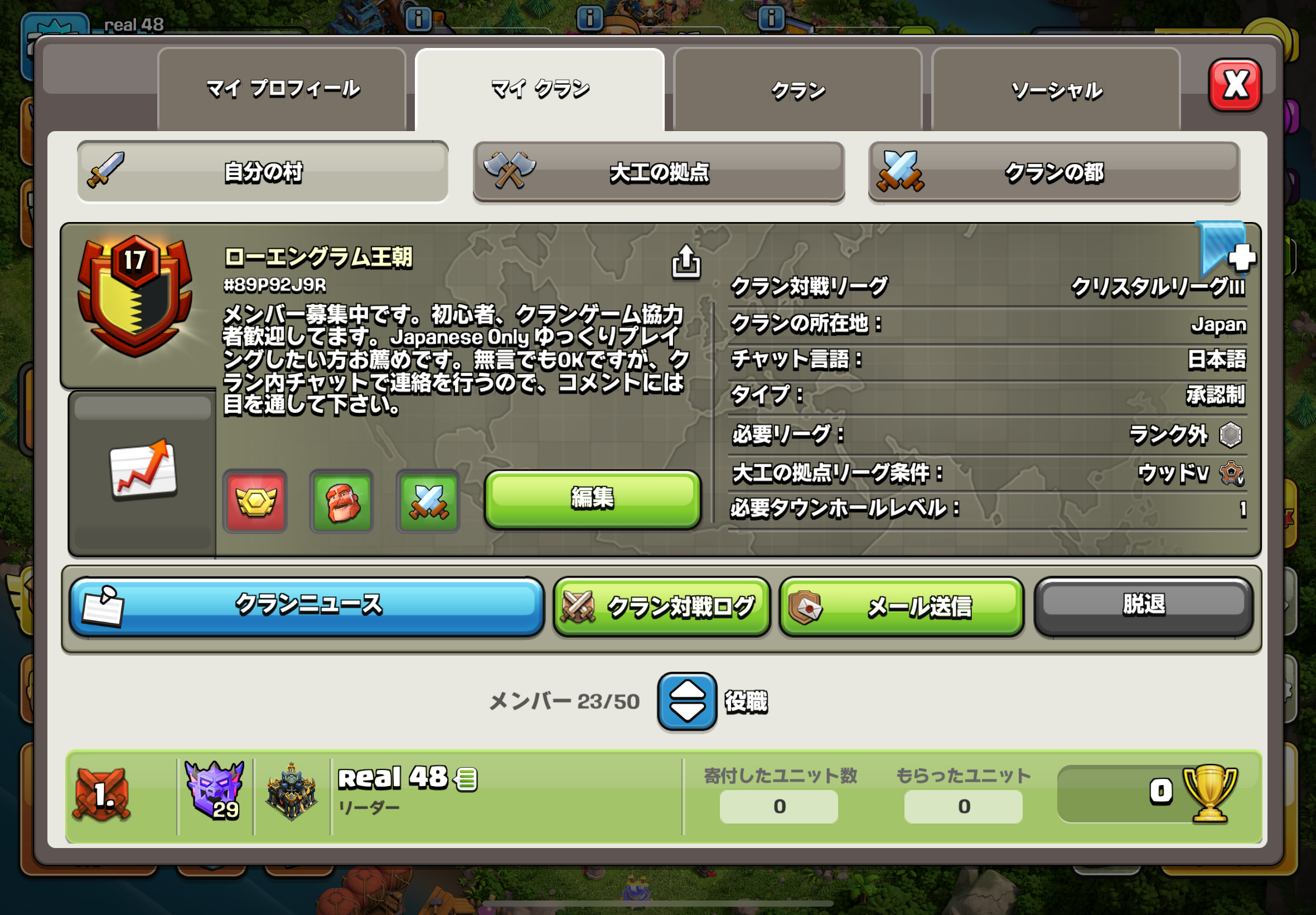 クランメンバー募集中です!新しく立ち上げたばかりのクランです!クラン対戦は積極的にやっていきたいです!みんなでクランを成長させて行きましょう!!