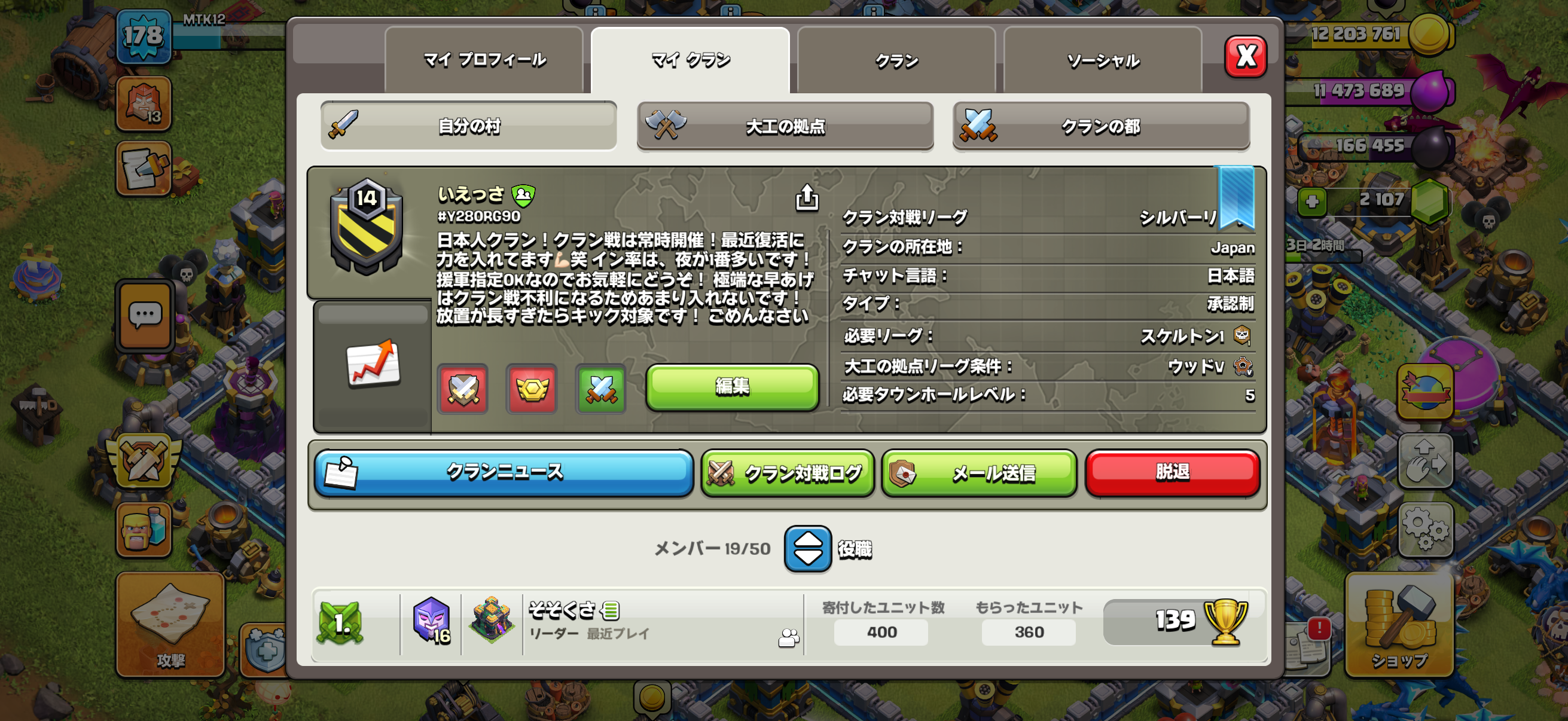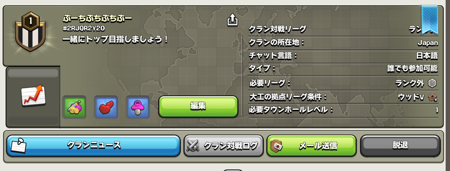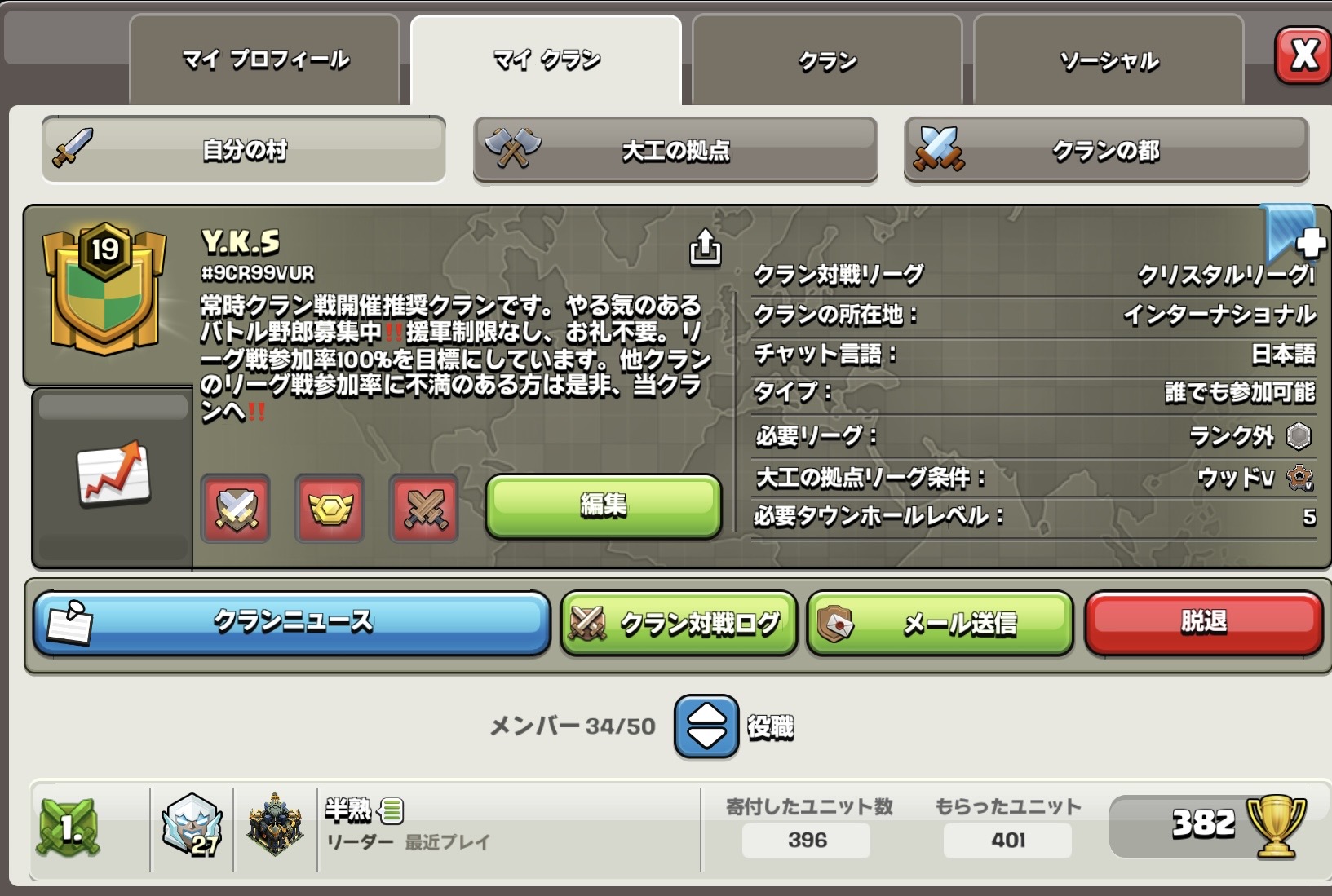 今日設立したばかりのクランです。リーダーのクランレベルまだ11なので初心者、復活組大歓迎です援軍貰い放題、無言でもOK♀️