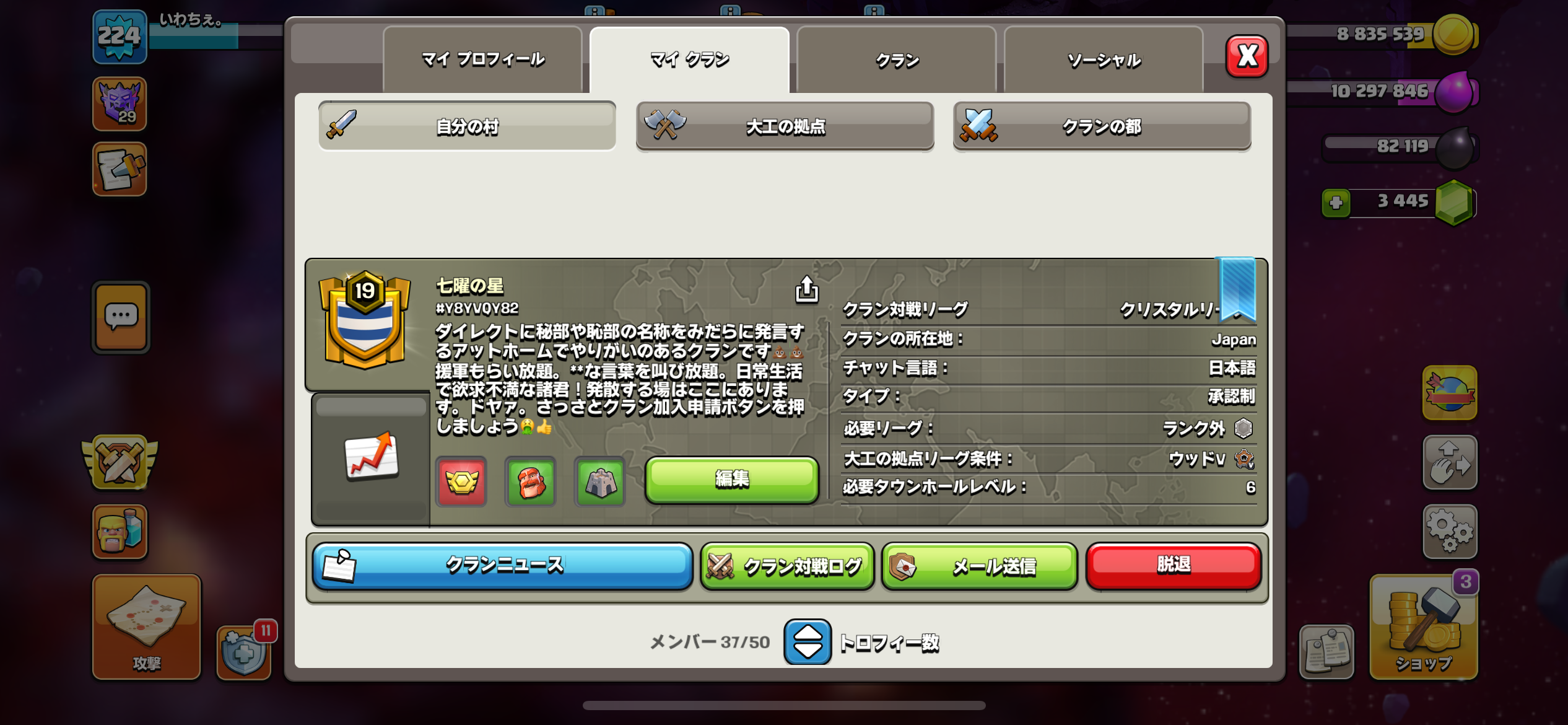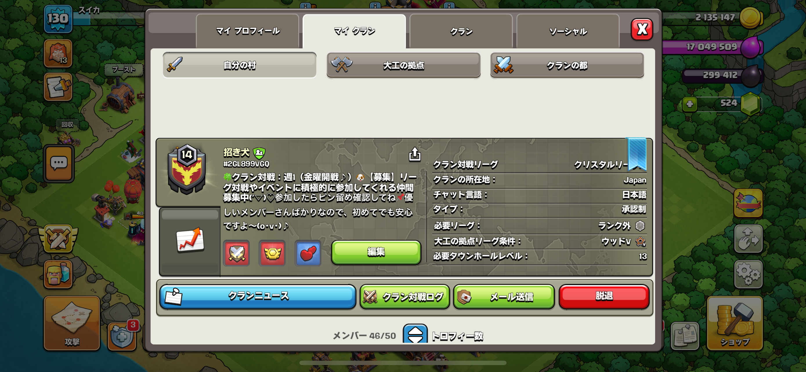 常時クラン戦、クラゲーMAX、空村(1500)やってます。