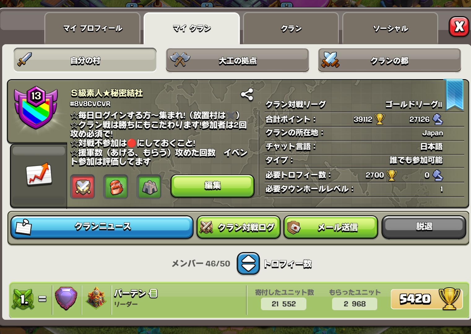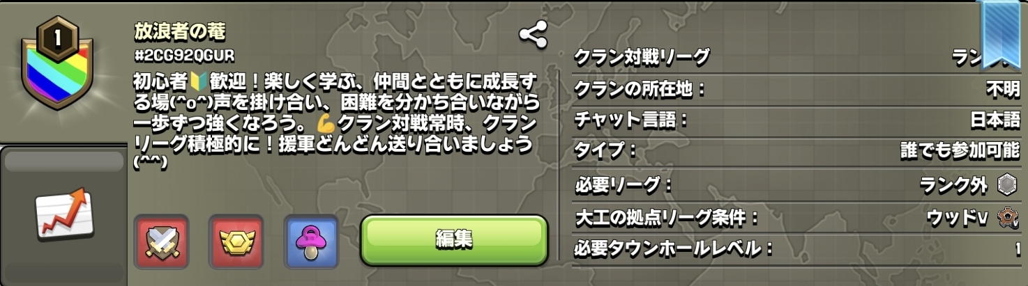 このクランでは楽しく、クラン戦は真面目に楽しく盛り上がってやれるクランです!あなたの居場所になれるようなクラン作り目指します!