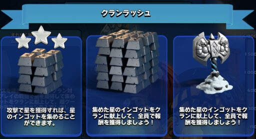 クランの合計貢献量が一定の量に到達することで、報酬を受け取ることができます。星のインゴットを集めても貢献しないとカウントされないので注意してください。